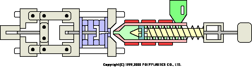 合模裝置是開閉模(mó)具以執行脫模作業,而(ér)且也有如圖所示的肘杆方式,以及利用油壓缸直接開閉(bì)模具的直壓方式。注射裝置是將樹脂予以加熱融(róng)化後再射入模具內此時,要旋轉(zhuǎn)螺杆,並(bìng)如圖所示讓投入到料鬥的樹脂停(tíng)留在螺杆前端,經過相當於所需樹脂(zhī)量的行程儲藏後(hòu)再進行(háng)射出。當樹脂在模(mó)具內流動(dòng)時,則控製螺杆的移動速(sù)度並在填充樹脂後(hòu)用壓力(保壓力)進(jìn)行控製(zhì)。當達到一定的螺杆位置或一定射出壓力時則從速度控製切換成壓力控製。